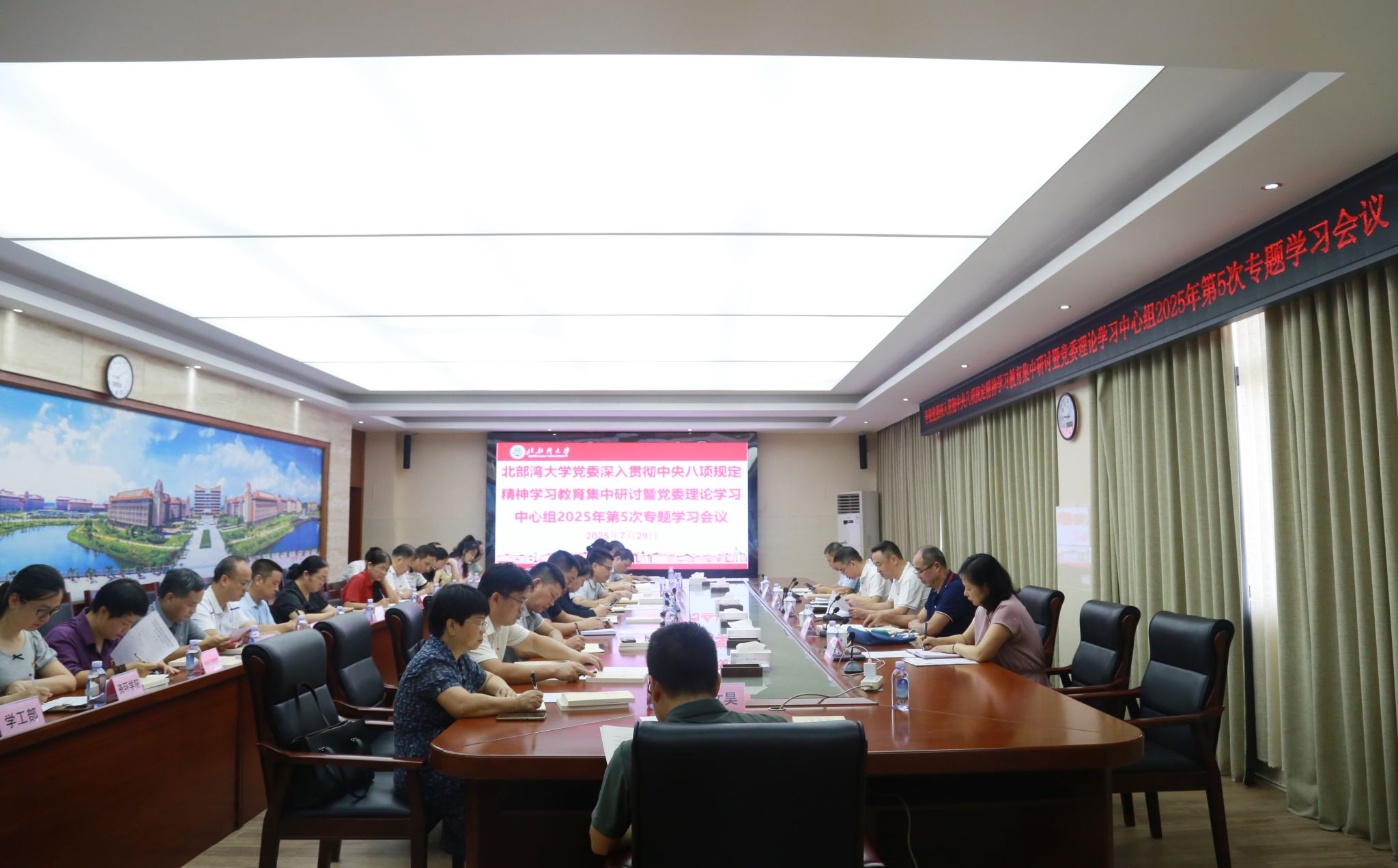 7月29日,学校党委深入贯彻中央八项规定精神学习教育集中研讨暨党委理论学习中心组2025年第5次专题学习会议在办公楼523会议室召开。校党委副书记、校长苗剑主持会议。
