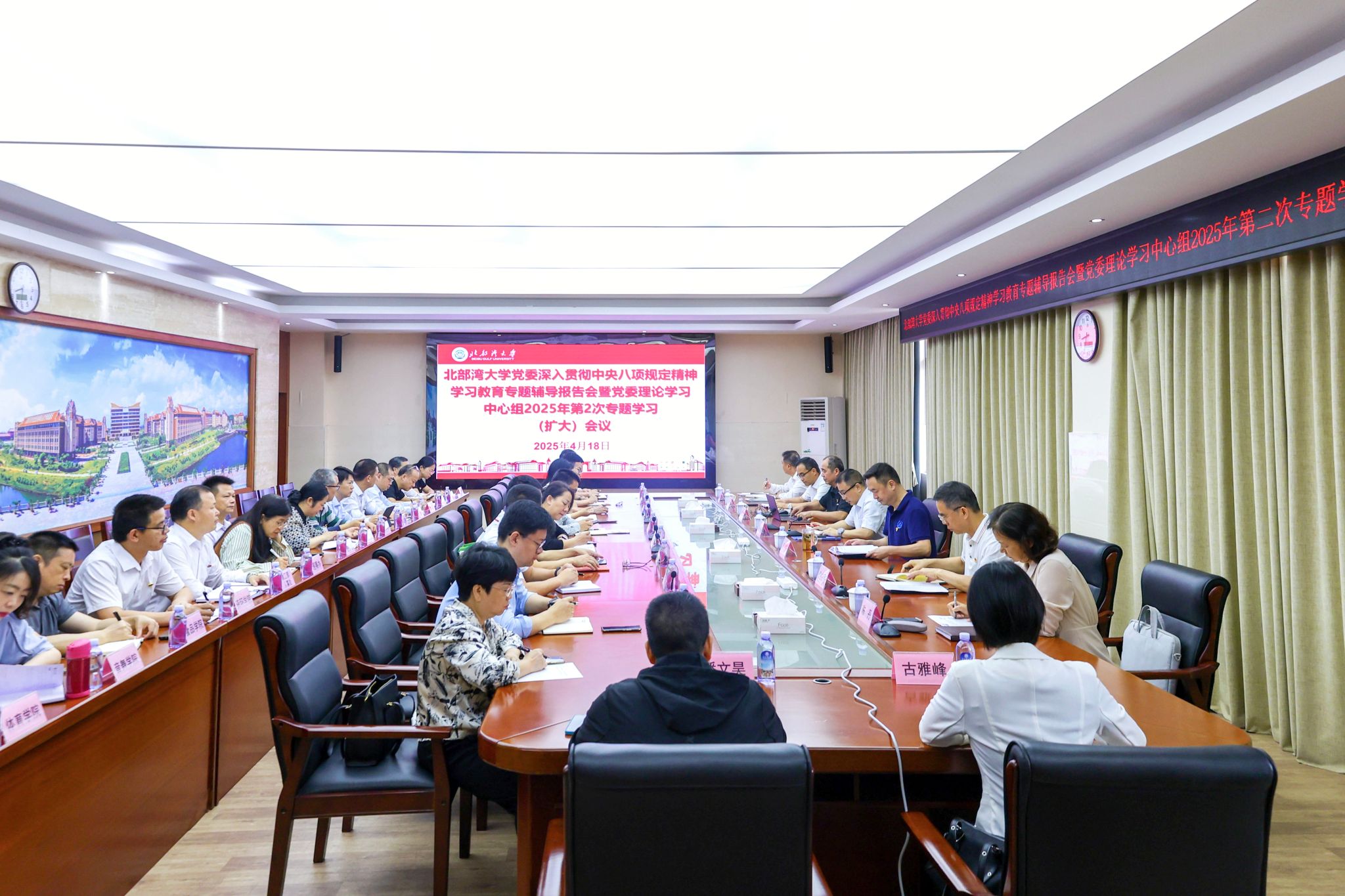 学校党委理论学习中心组在钦全体成员参加会议。校长助理、二层机构党组织书记及相关职能部门负责人列席。(李美晴 摄)