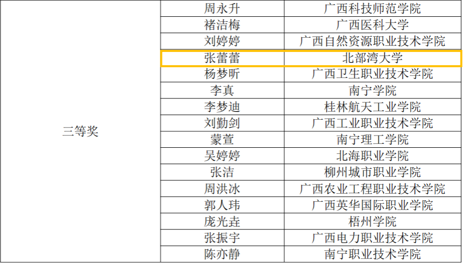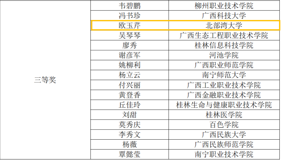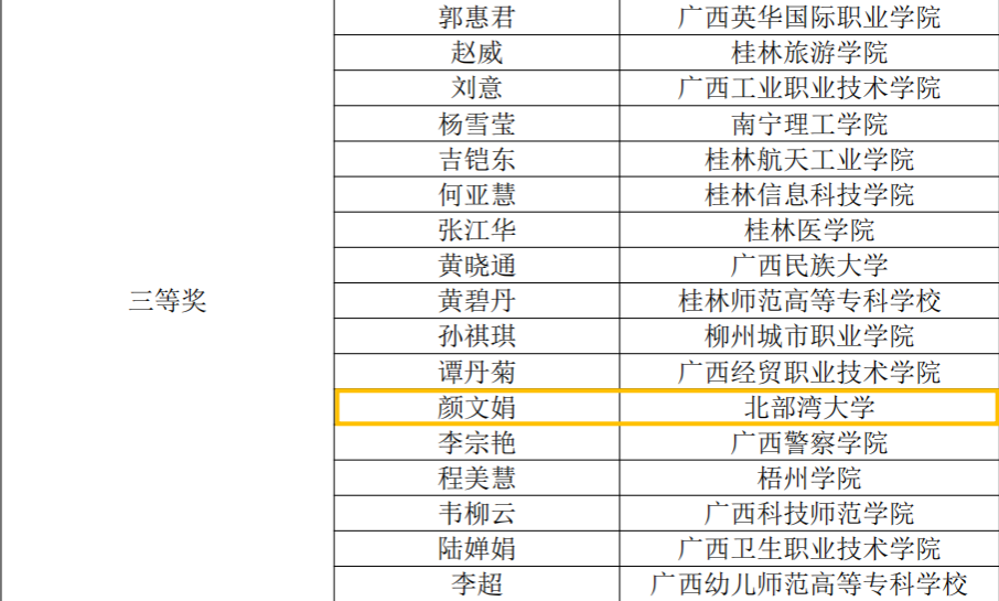 近日,第十届全区高校青年教师教学竞赛获奖名单正式公布,我校共有四名教师获奖。其中人文学院何晨老师荣获文科组二等奖,理学院欧玉芹老师荣获理科组三等奖,建筑工程学院张蕾蕾老师荣获工科组三等奖,马克思主义学院颜文娟老师荣获思政组三等奖。