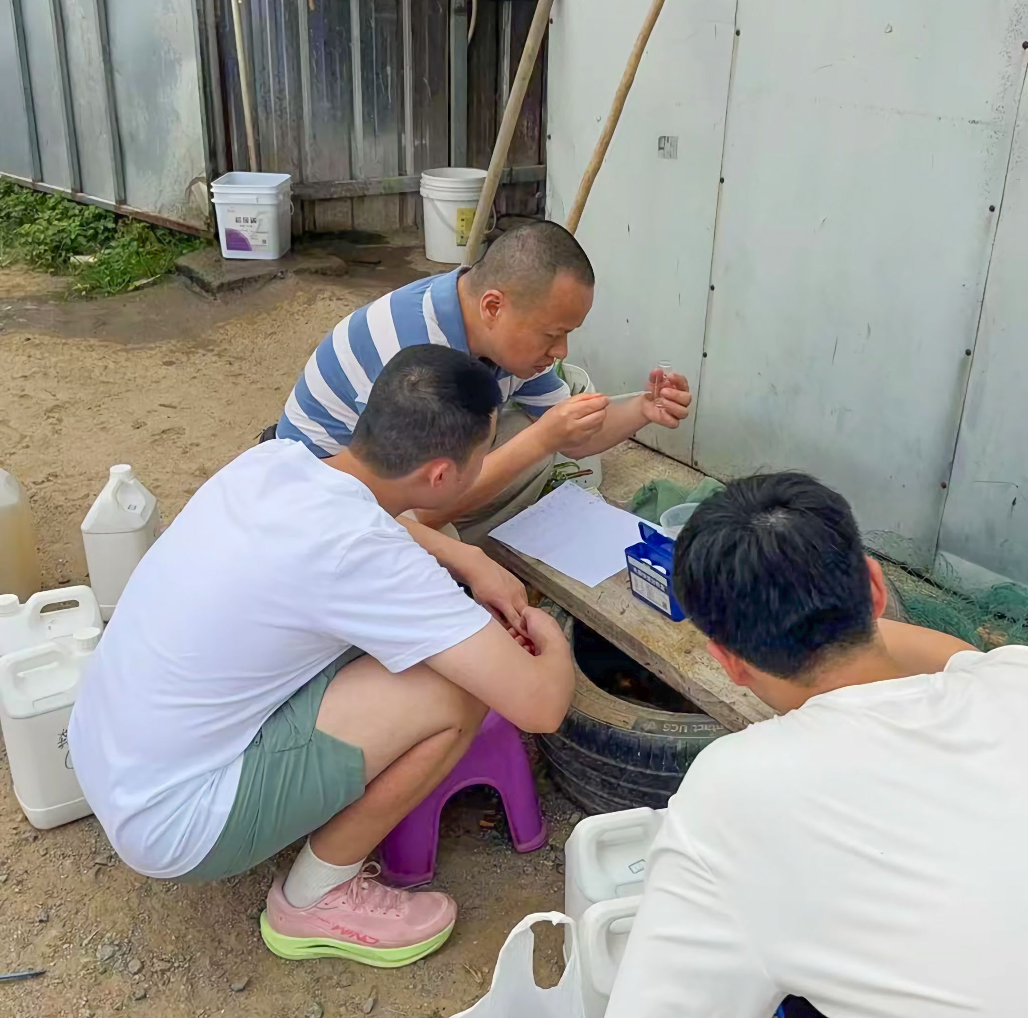 龚斌带领学生到养殖场检测对虾养殖水体的环境指标
